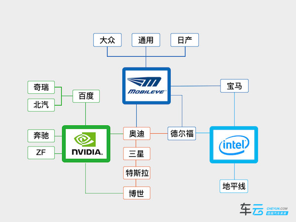 Mobileye在去年可谓是搅乱了自动驾驶的一池春水。Mobielye与大众、通用和日产签订协议,在Roadbook数据库建立上进行数据共享与完善;与宝马、英特尔一起进行技术研发,德尔福也在去年底加入这个阵营,进行平台通用化,Mobileye也借着德尔福与奥迪的关系,成为奥迪的供应商。英伟达与英特尔都加大了在汽车行业的布局,英伟达凭借着GPU的优势很快为自己找到了合作伙伴,包括主机厂与Tier 1,而英特尔目前的主要合作还是在宝马上。