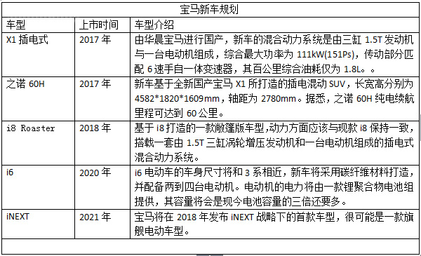 2017年规划:预计2017年可以实现年销10万辆新能源车目标。按照计划,到2017年宝马的即时充电桩将扩充至2500个,私人充电网络推广到54个城市。宝马将在2017年推出多款新能源车,其中SUV所占的比例最高。在中国,宝马集团将提供5个车系9款新能源车型,包括纯电动汽车和插电式混合动力汽车。