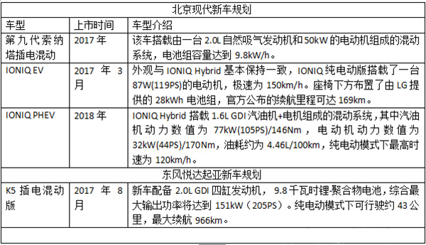 新车规划:现代汽车集团在华的新能源车阵营目前已布局2款车,分别为现代第九代索纳塔油电混动版和起亚K5油电混动版。现代起亚在华两家合资公司到2020年共计推出15款新能源车。其中,北京现代规划推9款,东风悦达起亚为6款。