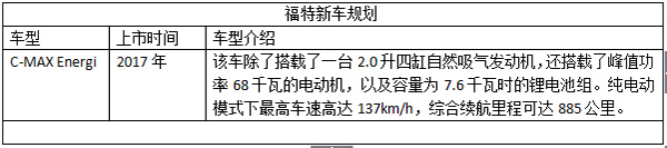 新车规划:未来五年内福特将推出13款新能源车,均有望引入国内。2020年之前会推出一款全新小型SUV,并搭载福特纯电驱动系统。新车的续航里程有望达到300英里(482公里)。另外还有一款插电混动MPV Transit Custom,也有望引入国内。