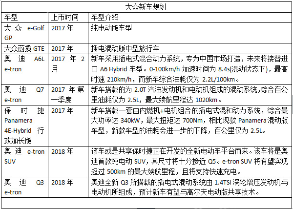 新车规划:大众集团未来在中国的新能源汽车规划,大众将在中国推出8款新能源汽车,包括e-Golf/全新途观L PHEV(基于MQB平台)、奥迪A6L e-tron/大众辉昂GTE(基于MLB平台)、大众I.D.量产车和奥迪e-tron quattro量产车(基于全新MEB平台)以及大众集团与江淮汽车集团合作而来的2款新能源车型。