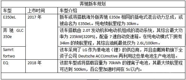 新车规划:奔驰计划到2017年推出10款插电式混合动力新车,同时也将加速混动车型国产化。10款车型涵盖多个车系,包括奔驰C 350 el、GLK、GLE 500e 4MATIC、GLE Coupe以及日内瓦车展曾发布的Vision e概念车的量产版,其余五款混动车型目前尚未公布。在推进混动车布局的同时奔驰还计划2020年底之前推出4款纯电动车。四款纯电动车中,GLA电动版或基于MFA平台打造,而其余三款将基于奔驰专属电动车MEA平台开发。